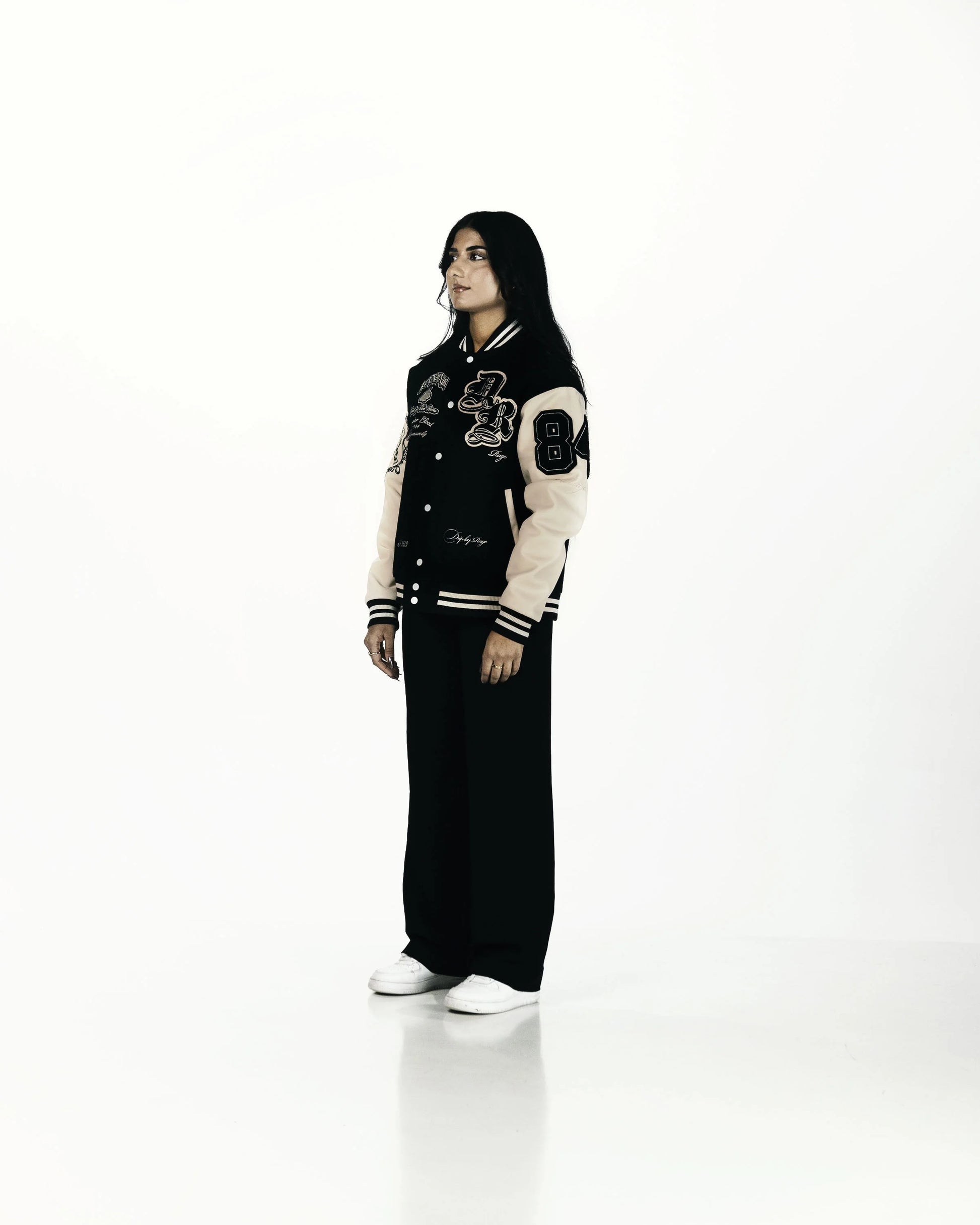 The Panjab Varsity Jacket is a bold celebration of heritage and modern street style. Featuring an embroidered "Panjab Motherland" design on the back, this jacket pays homage to the rich cultural roots and pride of the Panjab region. The black fleece body offers warmth and comfort, while the cream leather sleeves add a touch of luxury and contrast, giving the jacket a unique, sophisticated edge.